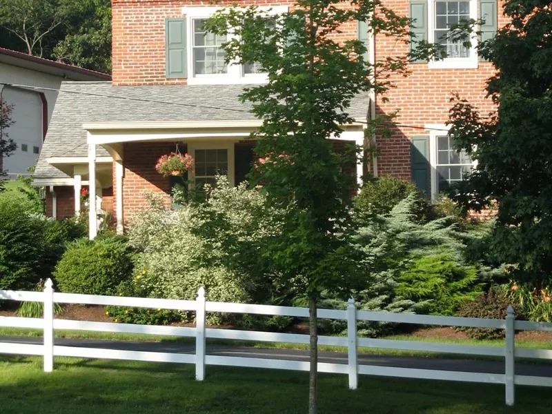 ● Hàng rào cảnh quan khu dân cư: Trụ PVC màu trắng kết hợp với đường ray ngang và cây xanh tạo nên ranh giới kiểu khu bất động sản kiểu Anh hoặc Mỹ cổ điển.