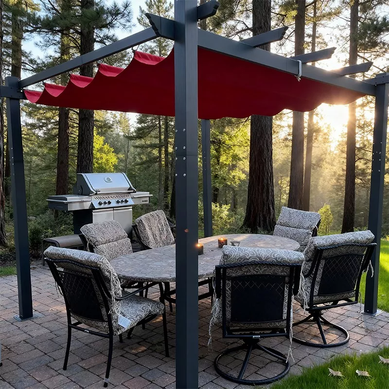 Hãy tưởng tượng: một miếng bít tết đang nóng hổi trên vỉ nướng, bạn bè đang tụ tập cùng nhau trò chuyện và cười đùa, rồi đột nhiên bầu trời bị mây đen che phủ. Với Pergola nướng bằng nhôm có thể thu vào của Vionta, bạn có thể dễ dàng mở mái nhà trong vài giây chỉ bằng một cú ấn nhẹ, cách ly nước mưa và đảm bảo các bữa tiệc không bị gián đoạn. Khi ánh nắng quá mạnh, nó sẽ cung cấp khả năng che nắng hoàn toàn, cho phép bạn và khách của bạn tận hưởng một môi trường mát mẻ và thoải mái.
