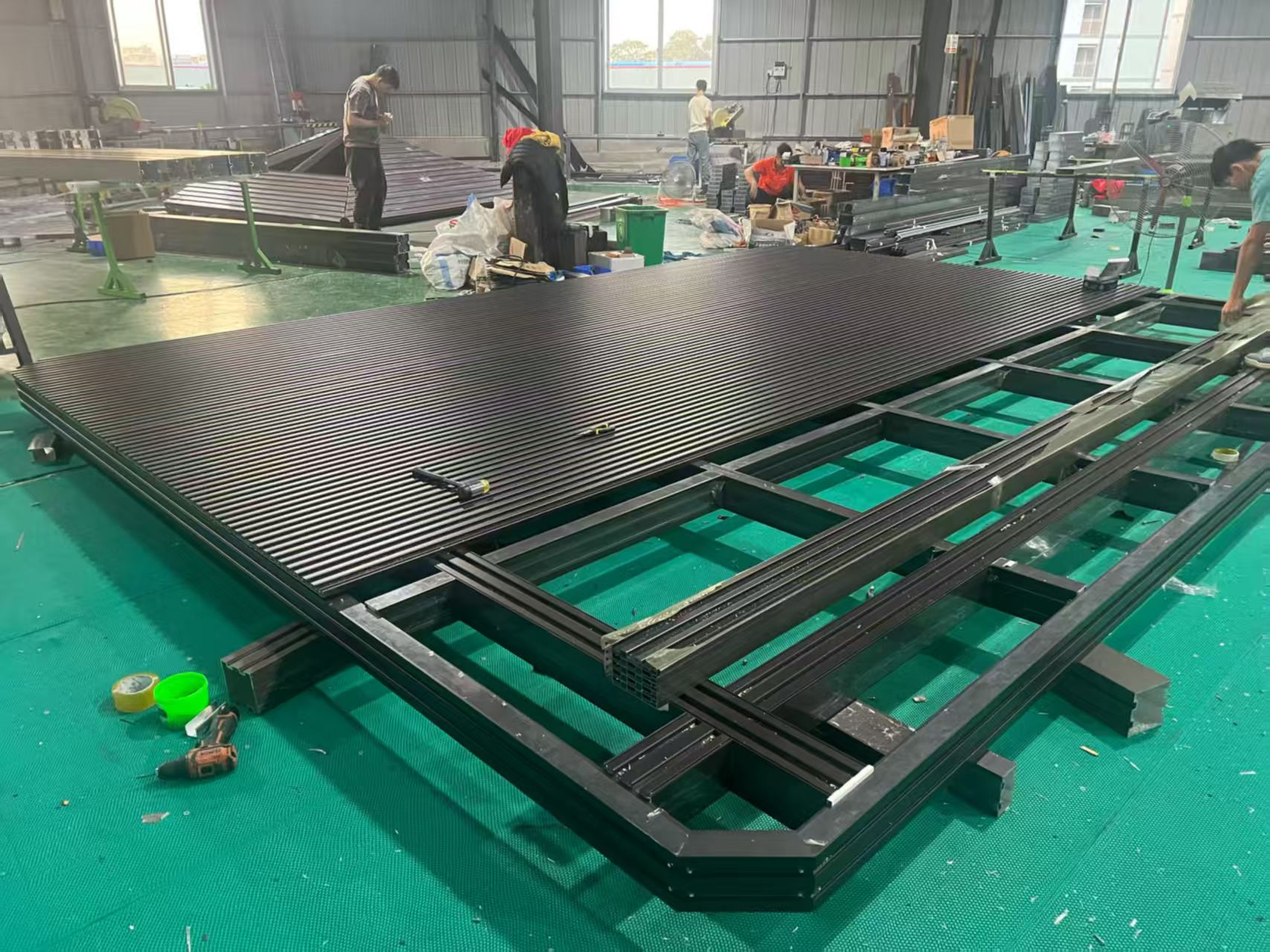 Trên sàn xưởng, các khung pergola lần đầu tiên được lắp ráp thành từng phần. Chúng tôi đặt cấu trúc bằng phẳng để việc căn chỉnh dễ kiểm soát hơn. Điều này giúp đảm bảo rằng mọi điểm kết nối đều vừa khít và kích thước tổng thể luôn chính xác.