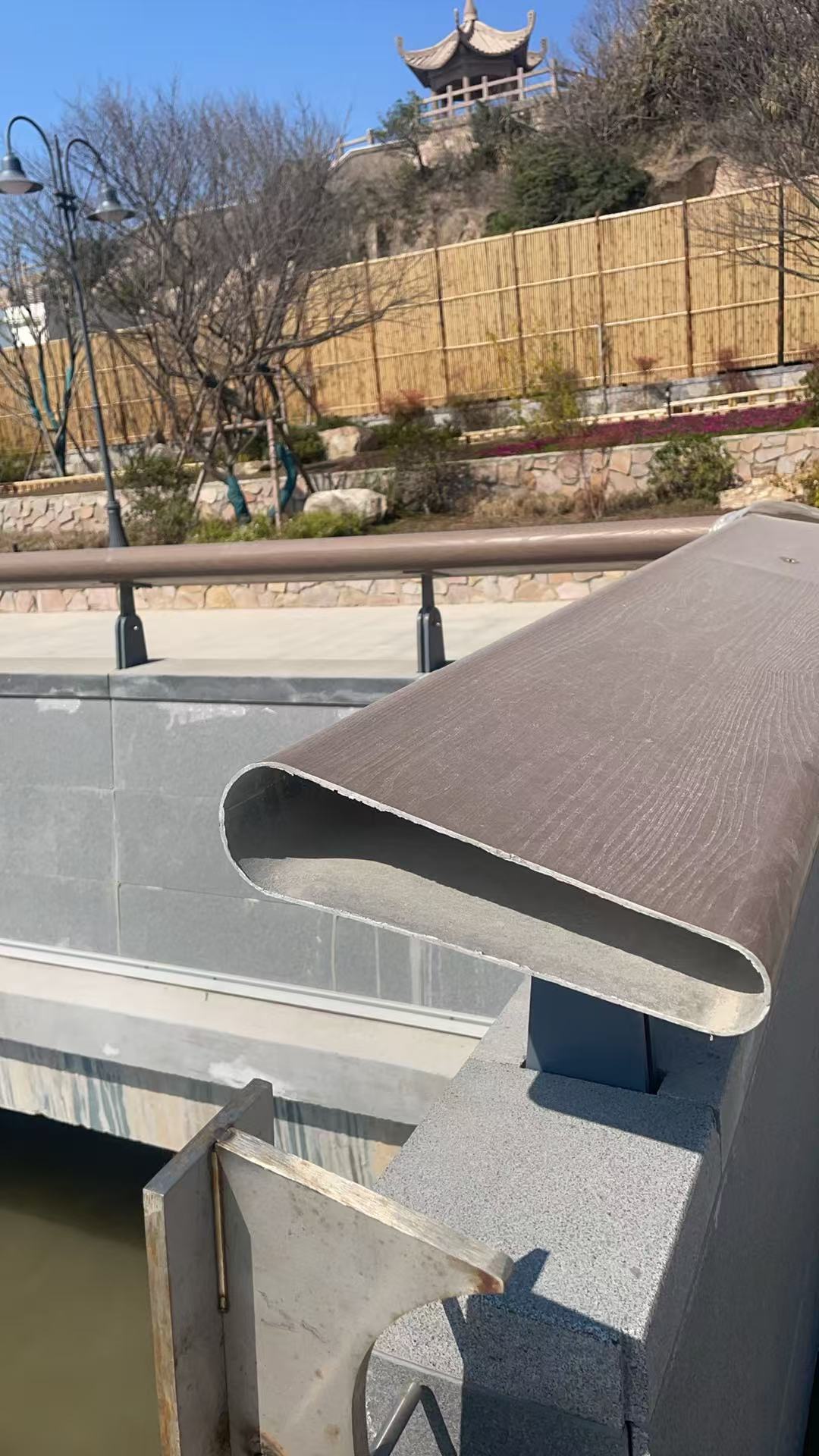 Dự án sử dụng vật liệu hợp kim nhôm và đạt được hiệu ứng thị giác gần giống gỗ tự nhiên thông qua công nghệ chuyển vân gỗ. So với tay vịn bằng gỗ nguyên khối truyền thống, hợp kim nhôm có khả năng chống ăn mòn vượt trội và tuổi thọ dài hơn, khiến nó đặc biệt phù hợp với môi trường ven biển có độ mặn cao.